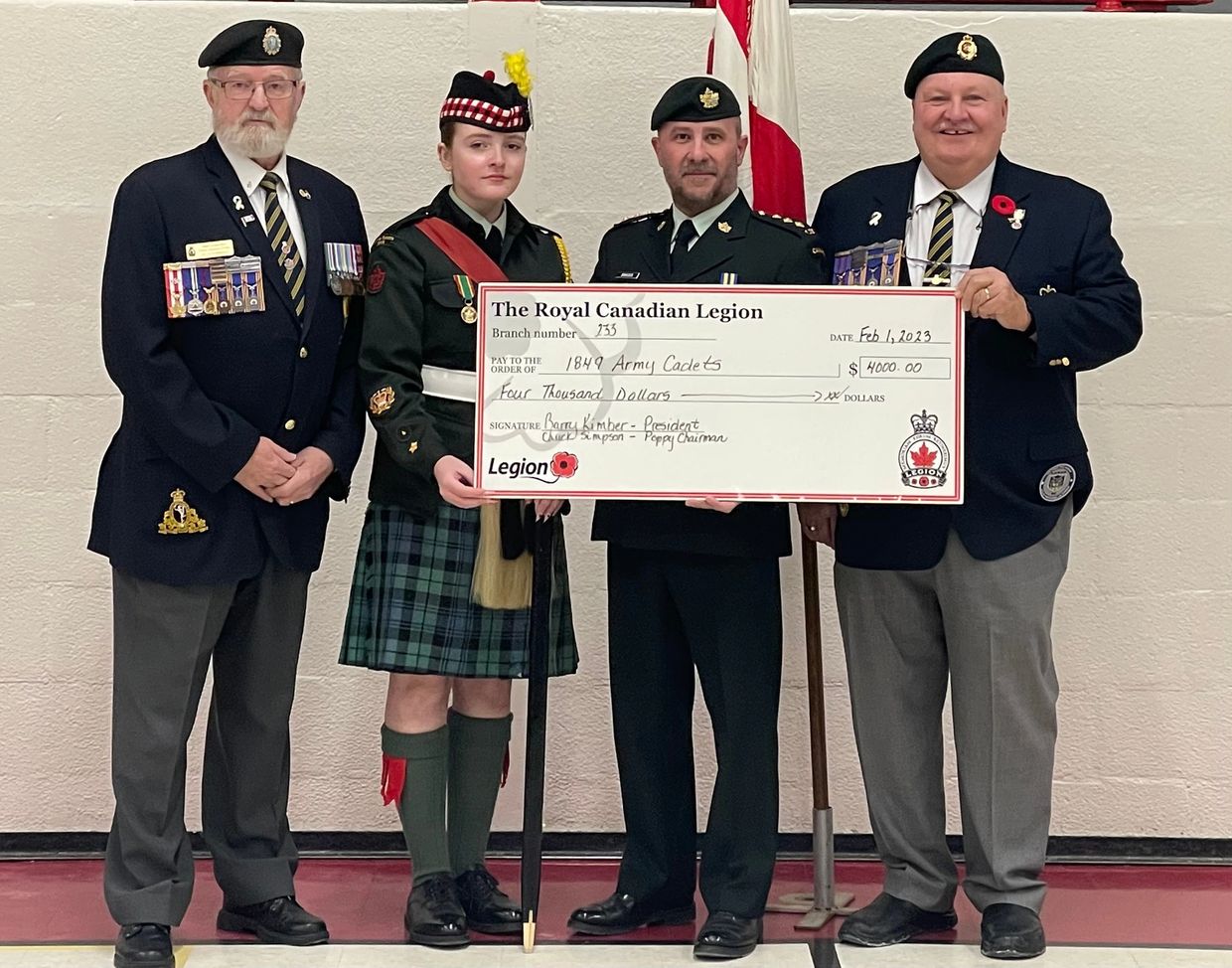 Branch 233 is pleased to support 1849 "Lorne Scotts" Royal Canadian Army Cadet Corps, Orangeville with this year's cheque for $4000. From lleft: 1st VP Chuck Simpson; Corps Sergeant Major, Chief Warrant Officer Post; Corps Commanding Officer; Captain Simoes; Branch President Barry Kimber.