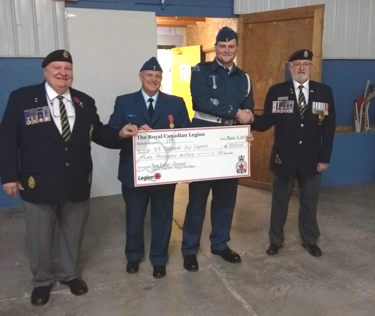 Branch 233 also supports 85 "Tornado" Royal Canadian Air Cadet Squadron, Grand Valley. President Barry Kimble (left) presented a cheque for $3000 to Commanding Officer Capt. John Smith and Squadron Warrant Officer. Also in attendance, 1st Vice President Chuck Simpson (right).